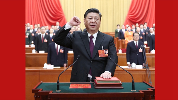 在熱烈的掌聲中,中共中央總書記、國家主席、中央軍委主席習近平走到主席臺中央,向全場人民代表鞠躬致意,掌聲經久不息。3天前,習近平以全票當選中華人民共和國主席、中央軍委主席,掌舵中華巨輪,團結帶領全國各族人民開啟奮進新時代的新航程。