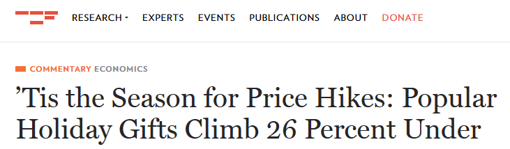 根據(jù)無黨派智庫世紀(jì)基金會(huì)(The Century foundation)、基石合作組織(Groundwork Collaborative)與美國教師聯(lián)合會(huì)(AFT)的最新聯(lián)合分析,這個(gè)假日季美國許多熱門節(jié)日禮物的價(jià)格大幅上漲,平均漲幅達(dá)26%,接近美國當(dāng)前整體通脹率的九倍。無論顧客在哪個(gè)貨架間穿梭,都會(huì)發(fā)現(xiàn)價(jià)格普遍上漲:家居用品和廚房用品的價(jià)格上漲了38%,電子產(chǎn)品上漲了34%,服裝、鞋類和配飾上漲了20%,玩具和游戲上漲了17%。