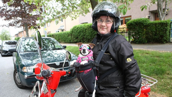 蘇格蘭,61歲的Ann為自家的愛犬打造了一個安全背帶,狗狗穿上粉色安全服、戴上墨鏡跟隨主人騎摩托車外出,在道路上超級拉風。