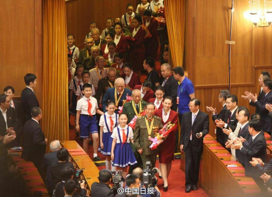 在紀念中國人民抗日戰(zhàn)爭暨世界反法西斯戰(zhàn)爭勝利70周年文藝晚會開演之前,70名抗戰(zhàn)老戰(zhàn)士緩緩步入人民大會堂,全體觀眾起立鼓掌,向他們致敬。(文字秦繼澤 攝影王壯飛) 在紀念中國人民抗日戰(zhàn)爭暨世界反法西斯戰(zhàn)爭勝利70周年文藝晚會開演之前,70名抗戰(zhàn)老戰(zhàn)士緩緩步入人民大會堂,全體觀眾起立鼓掌,向他們致敬。