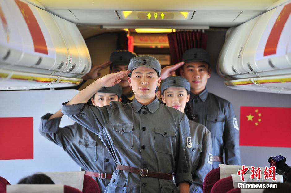 與往日不同,客艙登機口貼著醒目的抗戰(zhàn)勝利70周年紀念活動標識,客艙行李架則由五星紅旗和抗戰(zhàn)勝利70周年紀念活動標識共同組成兩道耀眼的“風景線”,航班乘務(wù)組變裝為英勇抗戰(zhàn)的八路軍戰(zhàn)士。