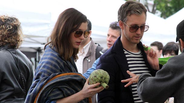 當(dāng)?shù)貢r間2016年5月15日,美國洛杉磯,安妮-海瑟薇攜夫逛菜市場。
