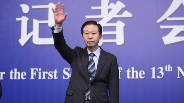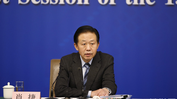 財(cái)政部部長(zhǎng)肖捷向記者舉手示意